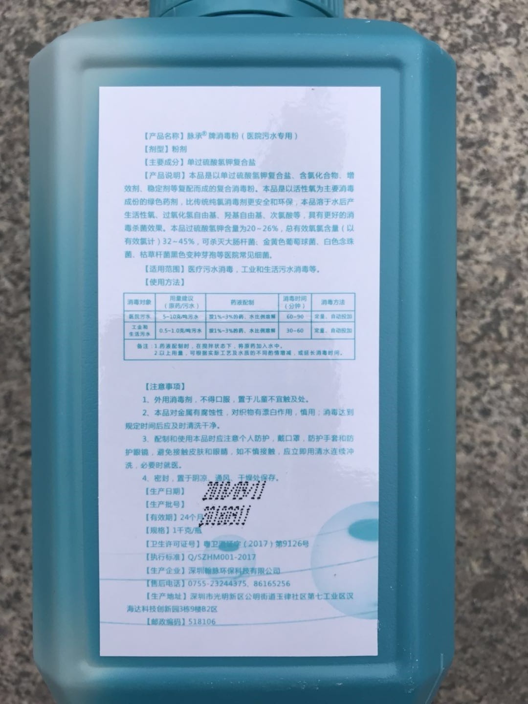 1 脉承牌消毒粉 脉承牌 1千克/瓶 870 脉承牌消毒粉(医院污水专用),粉剂,主要成分:单过硫酸氢钾复合盐