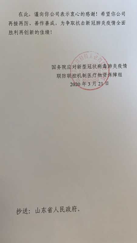 在此,谨向你公司表示衷心的感谢!希望你公司再接再厉、善作善成,为争取抗击新冠肺炎疫情全面胜利再创新的佳绩!
