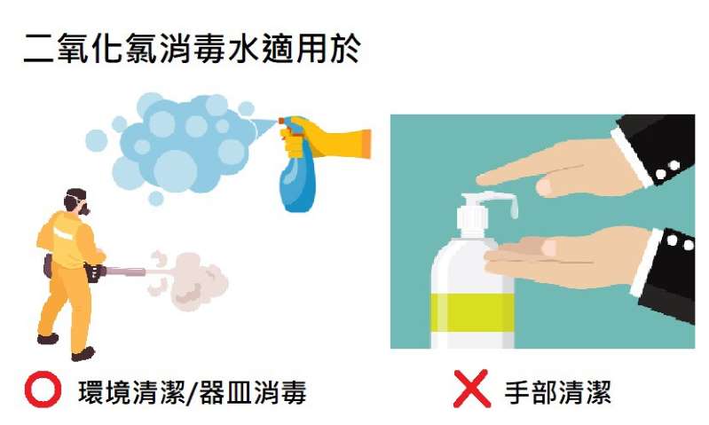 有些厂商会用二氧化氯消毒水取代酒精做手部清洁,但依照法规来说,只有化妆品才能用在人体肌肤上,如果宣传可在肌肤上杀菌,应先由食药署审查许可,所以不符合这些法规要求的二氧化氯消毒水,只能用于环境清洁消毒。