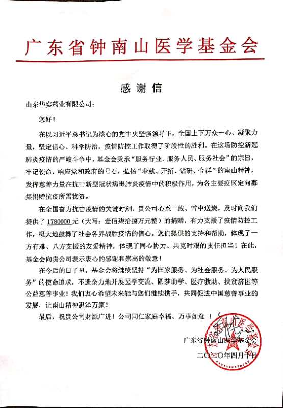 在全国奋力抗击疫情的关键时刻,贵公司心系一线、雪中送炭.及时向我们提供了 1780000元(大写:壹佰柒拾捌万元整〉的捐赠.有力支援了疫情防控工作,极大地鼓舞了社会各界战胜疫情的信心.您们提供的支持和帮助,体现了一方有难、八方支援的友爱精神,体现了同心协力、共克时艰的责任担当!在此, 基金会向贵公司表示衷心的感谢和崇高的敬意。