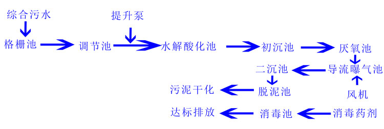 医院污水经管网收集首先经过格栅池,对来水的大颗粒悬浮物质经过隔栅池中的隔栅机进行初次去除,然后经过调节池对来水进行均质均量和预处理并兼有沉淀、中和、预酸化的作用,然后经过提升泵提升到水解酸化池中进行处理,在水解酸化池中污水进行水解、酸化,将难降解的大分子颗粒有机物质转化成易降解的小分子物质,从而提高废水的可生化性以及后续处理单元的负荷,然后污水自流进入初次沉淀池,在池中污泥进行初次沉降,经初次沉降过的污水进入厌氧池,进行厌氧处理,处理后再进入导流曝光气池进行曝气,使微生物大量繁殖,进一步分解污水中的有机污染物,然后经过溢流口自流进入斜管沉淀池,斜管沉淀池是在沉淀区内设有斜管的沉淀池。组成形式有斜管和支管两种.在平流式或整流式沉淀池的沉淀区内,利用倾斜的平行管或平行管道(有时可利用蜂窝填料)分割成一系列千层沉淀层,被处理的沉降的沉泥在个沉淀层中互相运动并分离。根据其相互运动方向分为逆(异)向流、同向流和侧向流三种不同分离方式,每两块平行斜板间相当一个很浅的沉淀池。该池使得系统内能够维持较高的微生物浓度。保证了良好的水质。处理后的污水进入二沉池进行二次沉淀,再一次是泥水分离,污泥经过污泥泵抽运至压缩机内将泥水分离定期运出,经沉淀后的污水进入消毒池消毒,在消毒池内污水经过次氯酸钠的液体消毒剂的消毒,使污水达标排入市政管网。