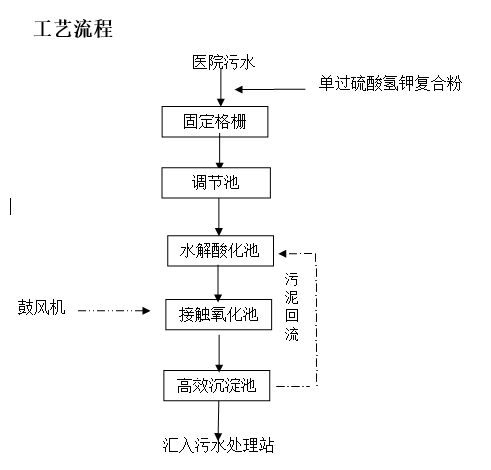 处理工艺:“固定格栅+调节池+水解酸化池+接触氧化池+高效沉淀池+汇入污水处理站”。