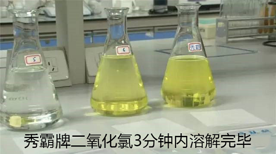 1、秀霸牌二氧化氯不到2分钟溶解完毕,而其他厂家的到5分钟时,还剩余大半;