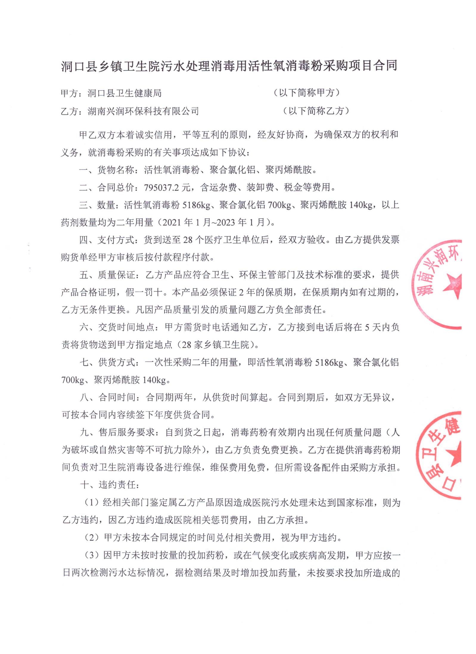 现将洞口县乡镇卫生院污水处理消毒用活性氧消毒粉采购项目已签订的合同公示如下: