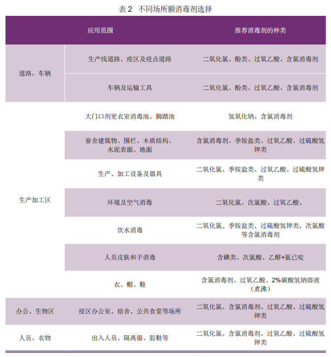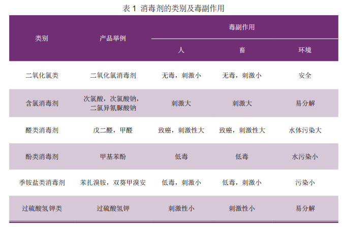 参考2019年9月份中国农业科学院兰州畜牧与兽药研究所编制的《非洲猪瘟防控清洁技术要点》整理的消毒剂的类别与毒副作用,如表1与表2。可以看出二氧化氯作为第四代消毒剂,无毒,使用安全,应用范围更广。