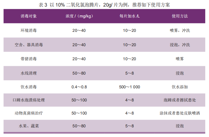 虽然目前二氧化氯在猪场使用没有得到普及,以北京众诚方源制药有限公司生产的10%二氧化氯泡腾片(20g/片)为例。而实际生产中二氧化氯在猪场消毒中的很多地方都可以进行应用,如表3。
