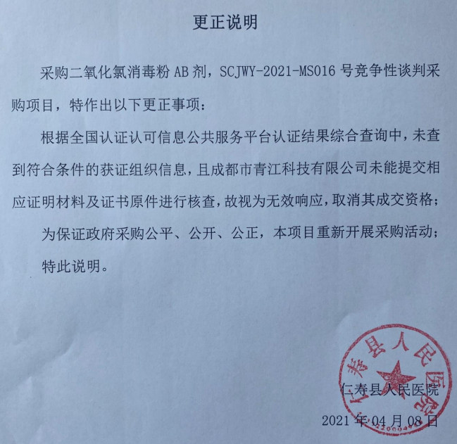 采购二氧化氯消毒粉AB剂,SCJWY-2021-MS016号竞争性谈判采购项目,特作出以下更正事项: 根据全国认证认可信息公共服务平台认证结果综合查询中,未查到符合条件的获证组织信息,且成都市青江科技有限公司未能提交相应证明材料及证书原件进行核查,故视为无效响应,取消其成交资格; 为保证政府采购公平、公开、公正,本项目重新开展采购活动; 特此说明。