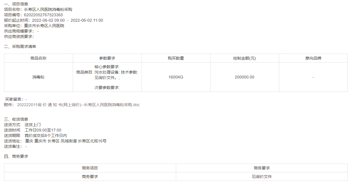 重庆长寿区人民医院消毒粉采购竞采公告