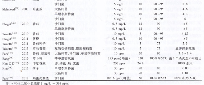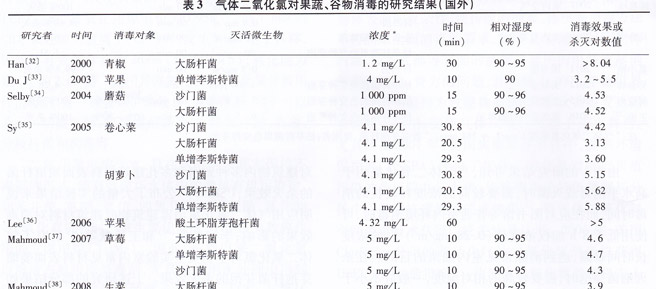 除了表3所列的消毒效果评价外,国外学者还进行了一些相关联问题的研究。Y.HAN等¨叫获得了气体二氧化氯处理青椒表面大肠杆菌的响应面模型,结果表明气体二氧化氯浓度为较主要的影响因素,而温度是次要的影响因素,浓度和相对湿度具有协同作用。Y.HAN等¨¨还研究比较了一次性注入和连续流气体二氧化氯对草莓表面大肠杆菌和单增李斯特菌的杀菌效果,结果表明,一次性注入4mg/L作用30 min和3mg/L连续流作用10mirl,均"获得>5的杀菌对数值。同样是普度大学食品科学系,Tzine!ta等N引针对行业关注的气体二氧化氯消毒后残留问题进行了研究评价,考察了西红柿、橙子、苹果、草莓、生菜、苜蓿及哈密瓜等七种水果蔬菜经消毒后的化学残留水平(包括二氧化氯、亚氯酸盐、氯酸盐、氯化物等),除生菜和苜蓿两种叶状蔬菜的残留较高外,其他均无明显残留。Arango等∞列通过监控气体二氧化氯的浓度量化了在气体二氧化氯消毒草莓过程中的二氧化氯消耗情况。Youn—sukLee等∞。0研究了气体二氧化氯在空气中的扩散速率因数,以及在黑暗、uVA、荧光灯等条件下的降解速率,为应用过程中量化气体二氧化氯的使用量提供了方法论依据。