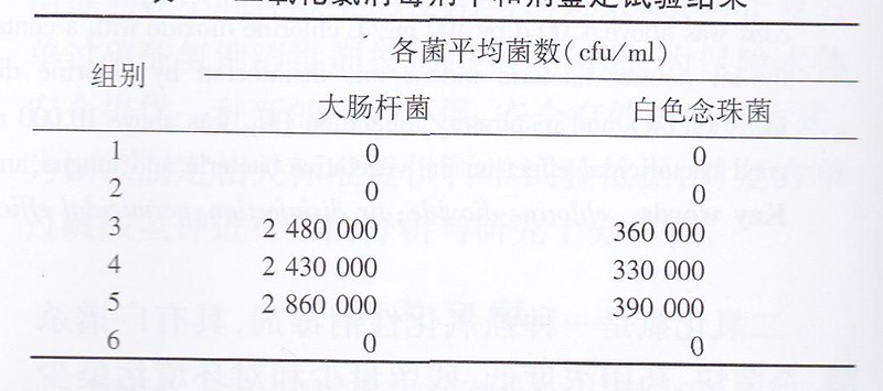 1.2.2中和剂鉴定试验选择大肠杆菌和白色念珠菌为指示菌,采用悬液定量法,试验在20℃水浴中进行,消毒剂二氧化氯含量为100mg/L,中和剂为1.0%硫代硫酸钠+1.0%吐温80PBS,作用时间为1min,中和时间为10min。第1组、第2组均无试验菌生长;降低消毒剂浓度为25mg/L,中和剂为1.0%硫代硫酸钠+1.0010吐温80PBS,作用时间为5min,中和时间为10min。第1组消毒液4ml+菌悬液1ml;第2组(消毒液4ml+菌悬液lml)取0.5ml+中和剂4.5ml;第3组中和剂4.5ml+(菌悬液0.1ml+硬水0.4ml);第4组(消毒液0.4ml+中和剂4.5ml)+菌悬液0.1ml;第5组稀释液4.5ml+(菌悬液0.1ml+硬水0.4ml);第6组稀释液+中和剂+培养基。经3次试验表明,在(20+1)oC水浴条件下,当消毒剂二氧化氯含量为100mg/L作用时间为1min时,第1组、第2组均无试验菌生长,第3、4、5组组间菌落数误差率为7.72%;降低二氧化氯含量为25m~L,中和剂为1.0%硫代硫酸钠+1.0%吐温80PBS,作用时间为5min,第1组平均生长菌落数为0cfu/ml,第2组平均生长菌落数为1050cfu/ml,第3、4、5组组间菌落误差率为7.14%。