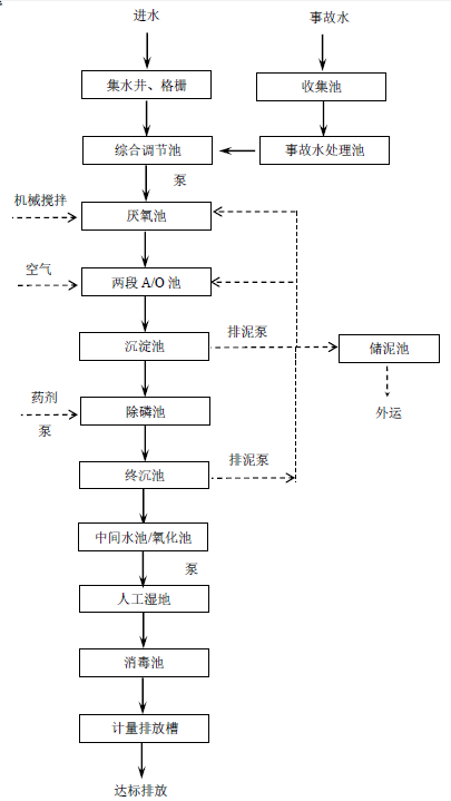 污水由收集管网自流至集水井内,集水井内设格栅,去除大部分较大的悬 浮或漂浮物,防止堵塞管道及设备,影响后续设备运行。集水井内设提升泵,污水由提升泵提升至综合调节池,均化水质、调节水量后由调节池内的提升泵提 升至集成设备,经该系统处理后废水进入臭氧氧化池,进一步去除有机污染物, 后自流经紫外消毒器,消毒后进入计量槽后达标排放。