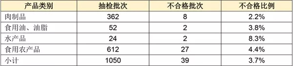 2018年10月16日,市场监管总局发布35号通告,抽检肉制品,食用油、油脂及其制品,水产制品和食用农产品等4类食品1050批次样品,合格样品1011批次、不合格样品39批次。其中肉制品抽查362批次,肉制品抽样比例约34%,涉及28省市,197家(生产)企业;产品主要是腌腊肉制品、酱卤肉制品、熟肉干制品、熏煮香肠火腿制品、熏烧烤肉制品;不合格样品8批次,主要为酱卤肉制品(4批次)和熏煮香肠(4批次),不合格率2.2%。总体而言,肉制品产品不合格率低,明显优于其他类别产品,见表1。