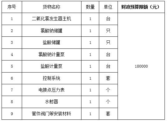 1、设备要求:全数字显示,可实现温度、计量、压力自动控制,并具有故障报警功能;有效氯产量3000g/h,并能与现有污水消毒设备并联使用。